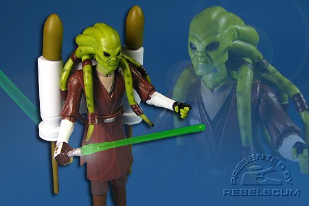 This Jedi Master belongs to the amphibious Nautolan species that can live comfortably in air or water. He has mastered difficult Jedi techniques that manipulate the movement of water for combat purposes. To aid him further in battle, he sometimes uses an underwater propulsion backpack.
