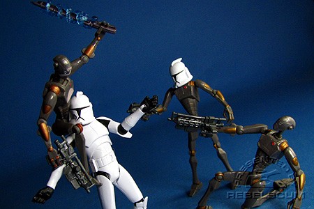 Commando Droids capture a Republic tracking station from clone troopers. The station guards the cloning centers on Kamino that are vital to the Republic. The clone troopers, — all rookies — who man the station are killed or forced to retreat. When two battle-hardened clone officers arrive, the inexperienced troopers join them in a fight to retake the station. Commando Droids: These droids are designed for stealthy infiltration and commando-style raids. Commando Droid Captain: Clone Trooper: ![]() |