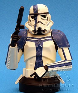 Blue armor markings distinguish the stormtrooper commander from the more common stormtrooper. Specially advanced ARC training gives the stormtrooper comamnder sharp intellect. A stormtrooper commander leads a typical squad of stormtroopers, but they may advance into an Imperial officer's rank if potnetial is displayed.