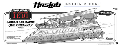 We're also deep into interior and exterior packaging development. We are constructing and testing our interior packout, so the barge is easy to access and also protected for when it is shipped to you. We're implementing a new way to open the box using tabs instead of glued and taped edges. This allows easier access to the barge. Instead of sliding it out of a traditional box, you "unwrap" the barge, revealing the accessory tray, polystyrene protected hull, Jabba Figure, and the exclusive Yak Face on Power of the Force cardback with collectable coin!