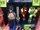 "Lightsabers and fan spinners at Walgreens. All come with candy Boba, Vader, Obi, Luke and Leia. Rebel, Imperial and Republic symbols. They even light up!"
