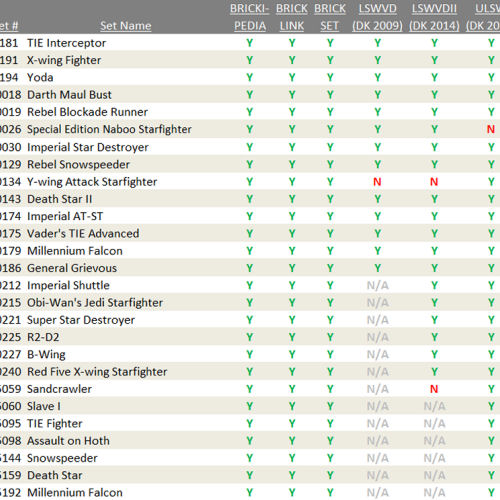 Of these 34 sets from 2000 to 2017, there are 28 sets which appear on all four main sources - Brikipedia, Bricklink, Brickset and at least one of the DK books. Taking this reduced tally as the mean it is possible to determine what factors are most common, and use these to decide what criteria is relevant to resolve a final checklist.